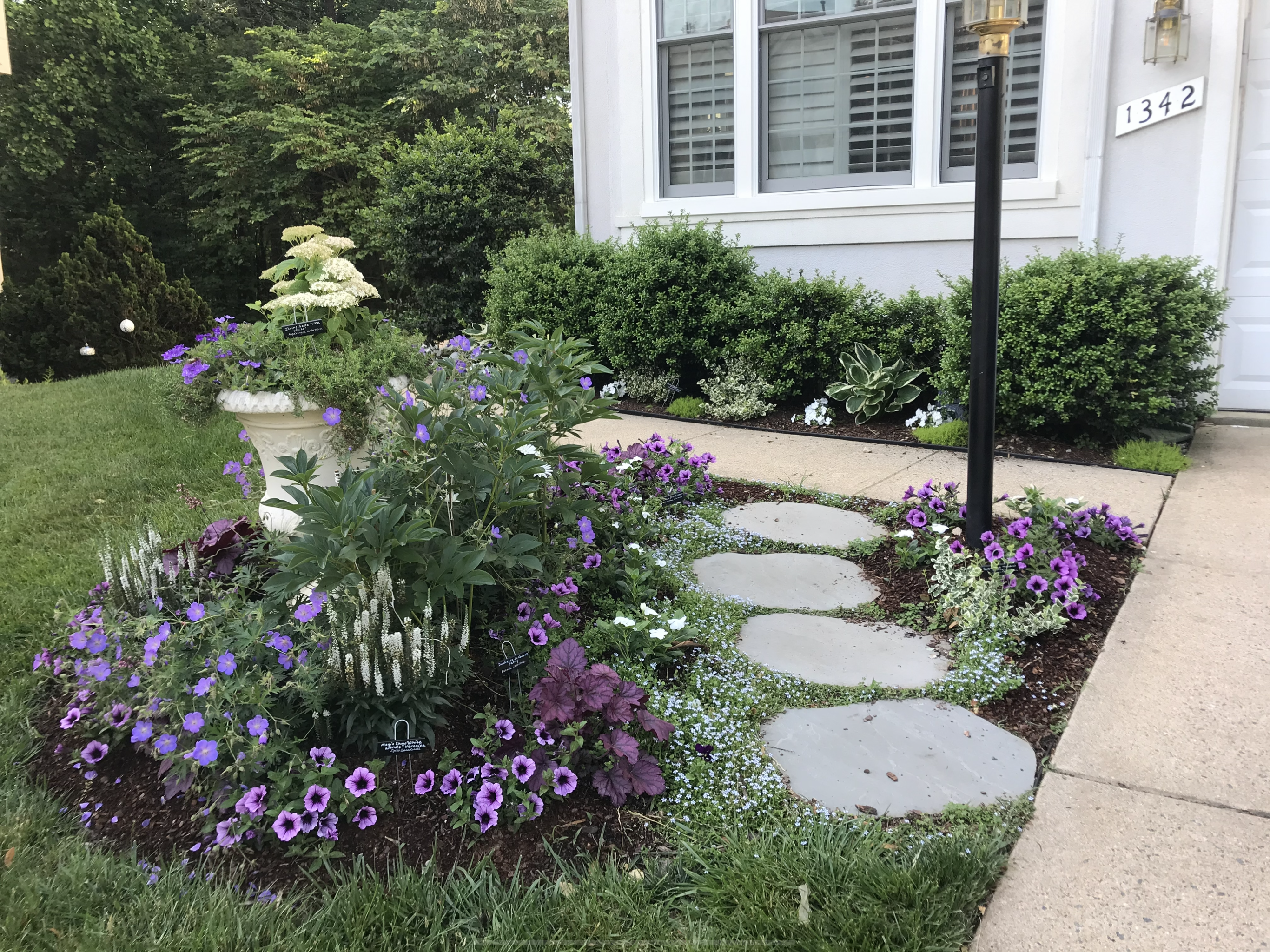 Last year’s plantings started with a french country-style garden of cool blues, purples, whites, and greens in the front. Turning the corner revealed a pea graveled sitting area, a more formal container garden with iron trellises, evergreens, and colorful annuals. Continuing on the sidewalk led to stairs winding down a side slope, where a perennial border of neat plants in warm, creamy whites, bright pinks, and greens. Those led to a woodland moonlight garden in the back. A deck above held hot sun-loving containers spilling over the rails.